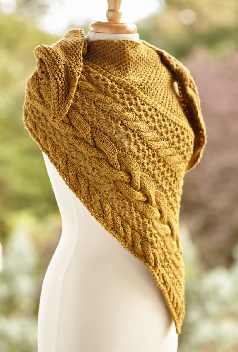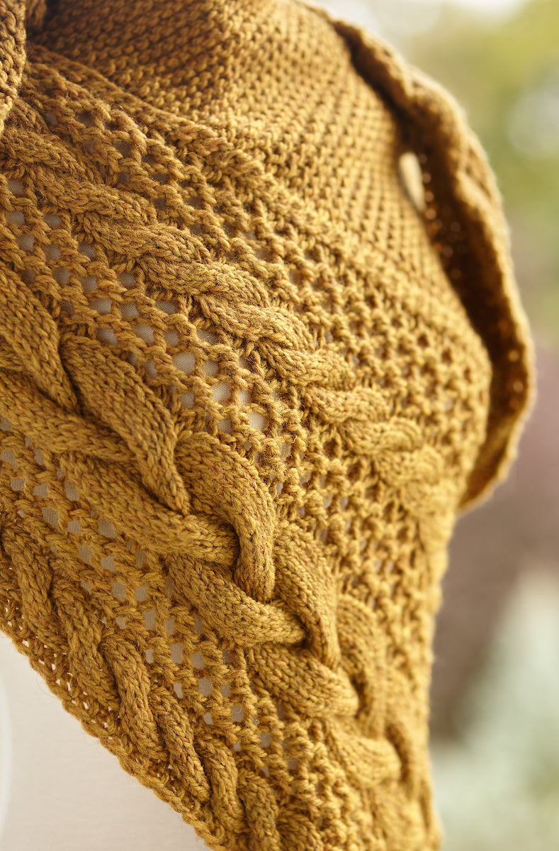 Out of stock, but we can custom make this one again for you! Send us a message to inquire about color options. This shawl is an amazing combination of a trendy mustard color, cables, and lace. Knit out of 100% wool.