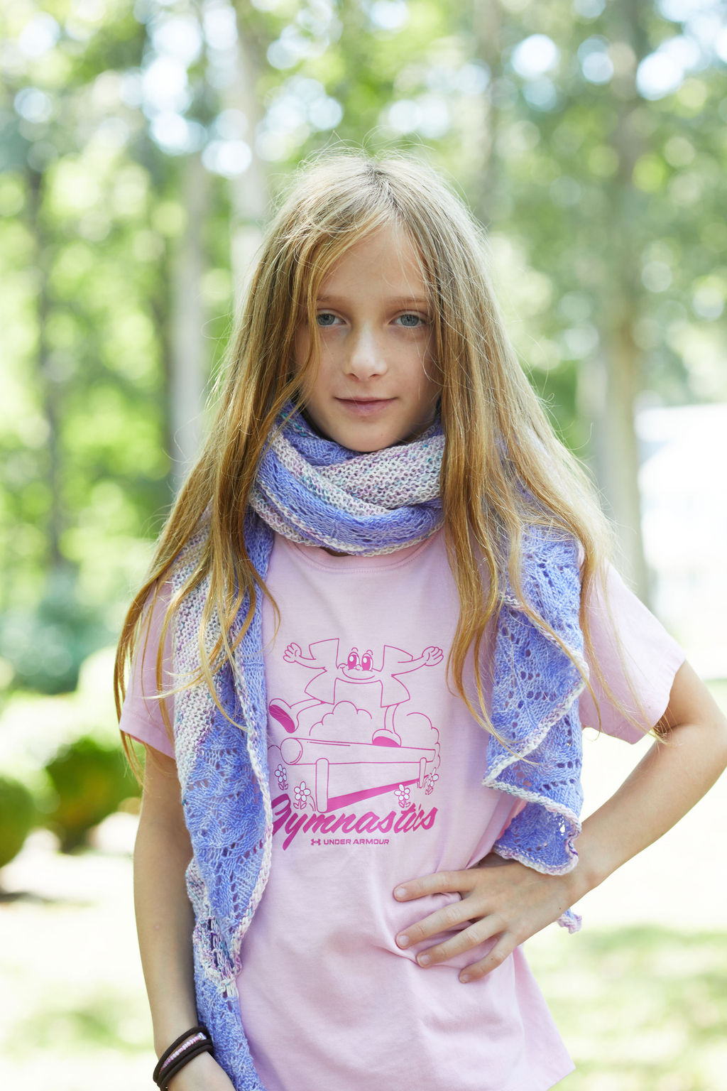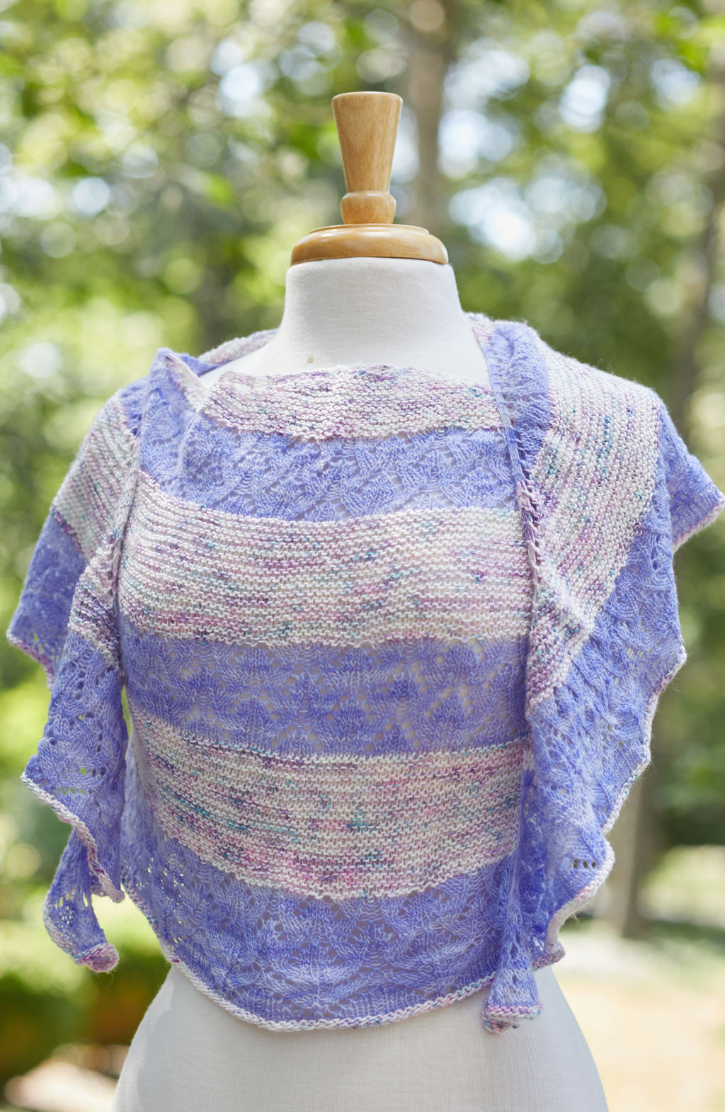 This shawl wasn’t on the agenda—but when a favorite yarn shop launched a flash craft-along, I couldn’t resist. The challenge: pair unexpected yarns from your stash. I chose a soft speckled base and a periwinkle laceweight to create something airy, delicate, and joyful. Modeled by my daughter, this shawl showcases how spontaneous creativity can yield something truly special.